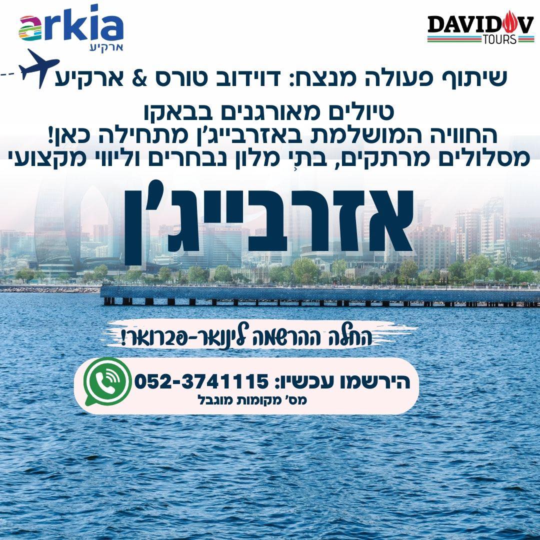 אנו שמחים לבשר על שיתוף פעולה בין חברת דוידוב טורס לחברת ארקיע בטיולים מאורגנים לבאקו, בירת אזרבייג׳ן. חופשה של 5 או 7 ימים בחודשי ינואר ופברואר, במחירים הנמוכים ביותר ובסטנדרט הגבוה ביותר. החבילה כוללת: טיסה וכבודה, אוטובוס תיירים, הדרכה בעברית, כניסה לאתרים נבחרים וליווי מקצועי לאורך כל הדרך. לפרטים נוספים והזמנה ישירה באתר ארקיעלחצו כאן לייעוץ אישי והרשמה, חייגו עכשיו: 052-3741115 (דפנה). החלום לטיול המושלם שלכם יוצא לדרך.